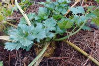 Celery root in pot in greenhouse, waiting for harvest