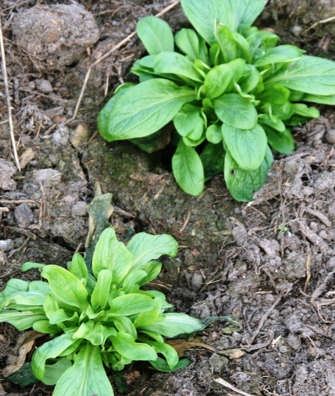 Corn salad plants in a greenhouse, after a longer period of winter frost