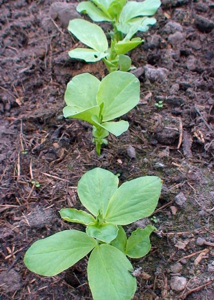 Fava bean plants in midwinter. These have been sown in autumn. Fava beans can withstand frost and these plants will give harvest in early spring.