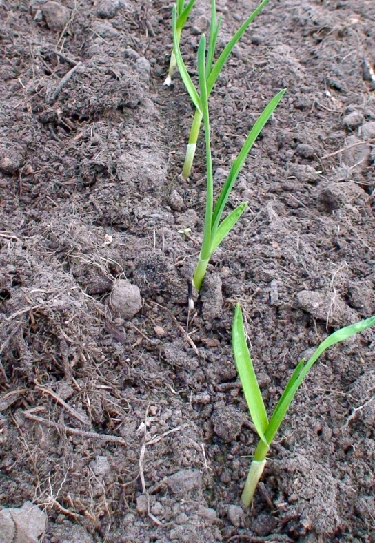 Garlic in midwinter. Garlic needs a long time to grow. These plants have been planted from cloves at the end of autumn in a moderate climate. They can withstand freezing temperatures in winter.