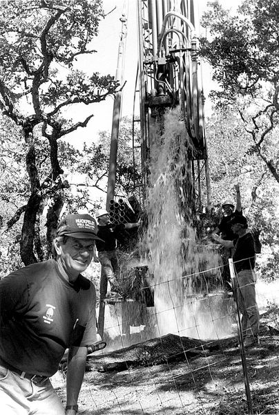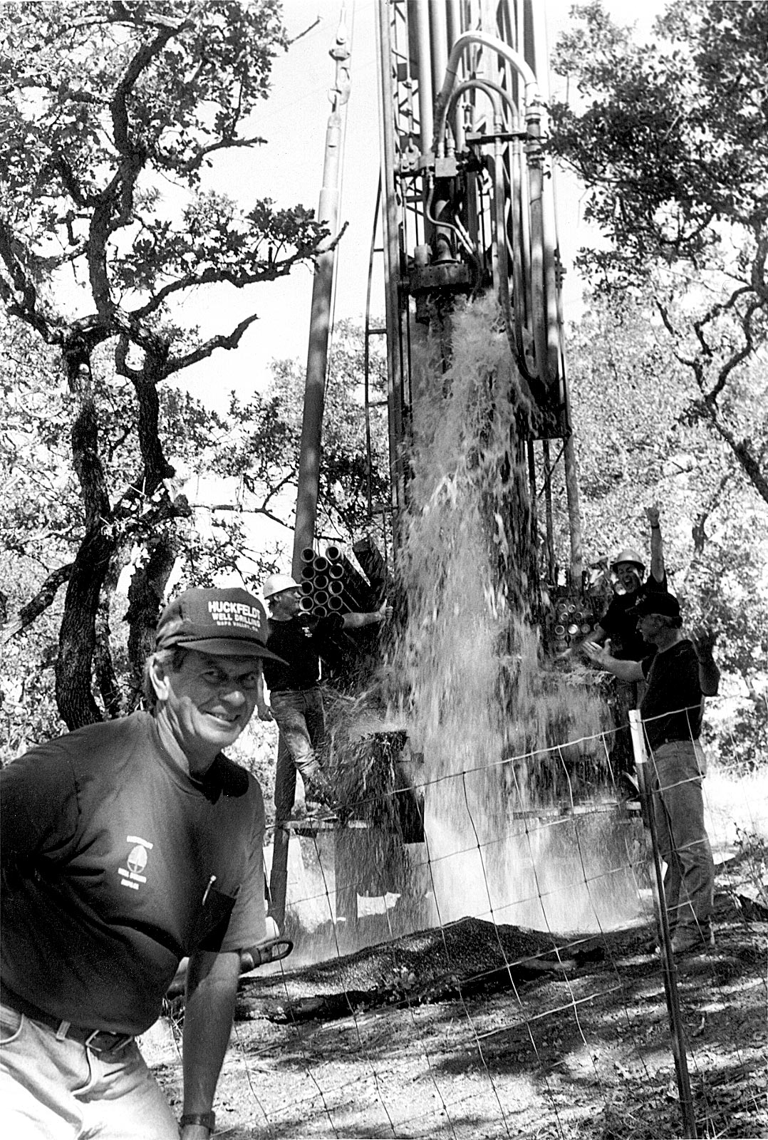 Napa Valley well driller Lloyd Huckfeldt. We staged this photo for an advertising campaign for Huckfeldt Well Drillers in 1999. The image is supposed to represent striking water during a drilling job. In reality, the picture was staged. What's taking place is a blast of air through the drill bit to flush water from the newly drilled well. In this case the drillers found over 50 gallons per minute (gpm) on a hillside in Napa around 180 below the surface. This is one of my favorite and most famous photos and the campaign generated quite a bit of new business for Lloyd and his sons.