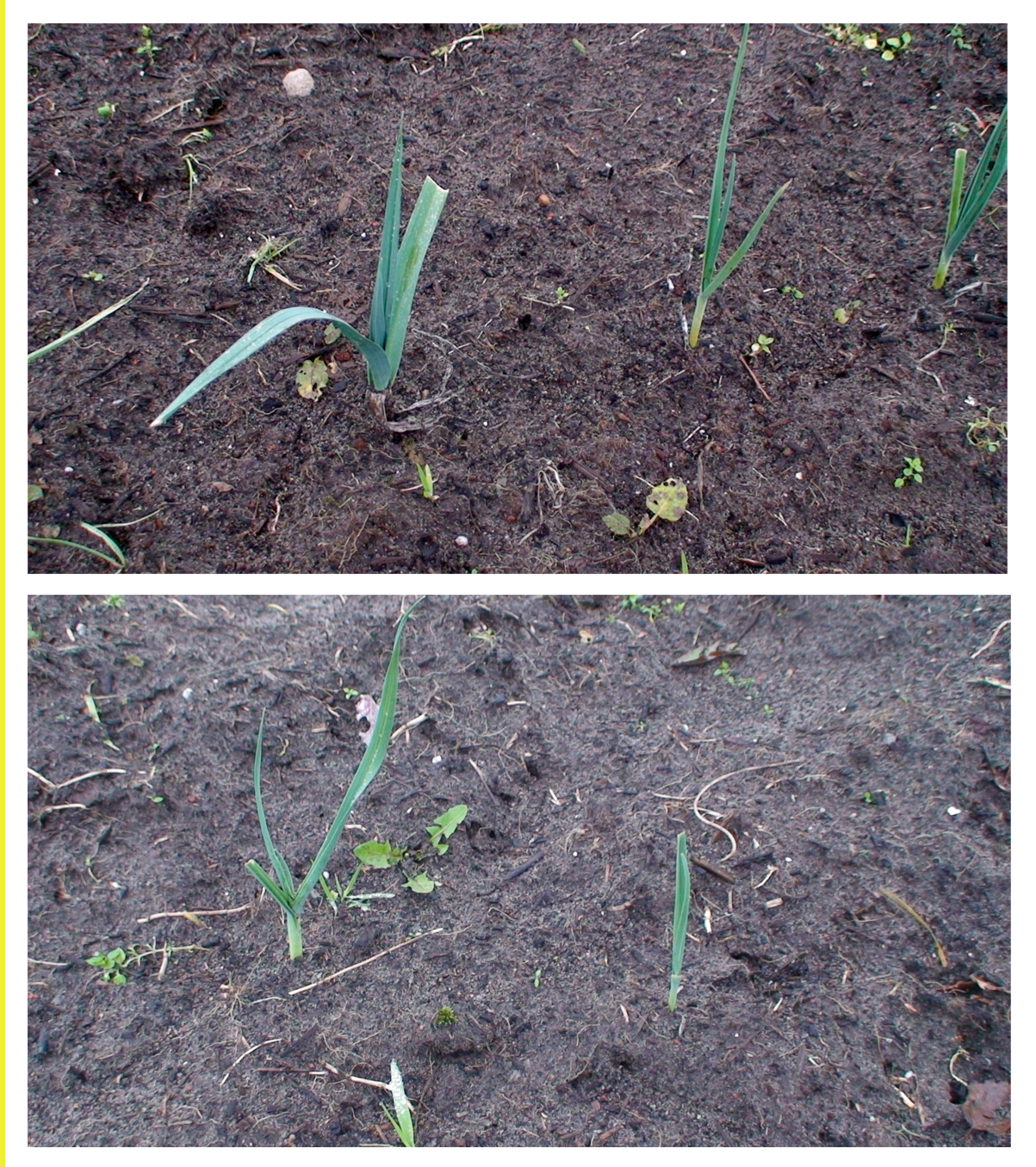 Young leek plants. The top ones grow in soil that was dug out almost two feet deep. The bottom ones in soil that was dug out one spade deep. The top ones grow faster.