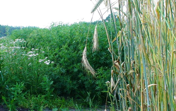 Lupin in my garden. The plants you see are one row of plants, over 1 meter high and 1 m wide. They are also excellent for green manure or animal fodder. Rye almost ripe at the right, yarrow at the left.