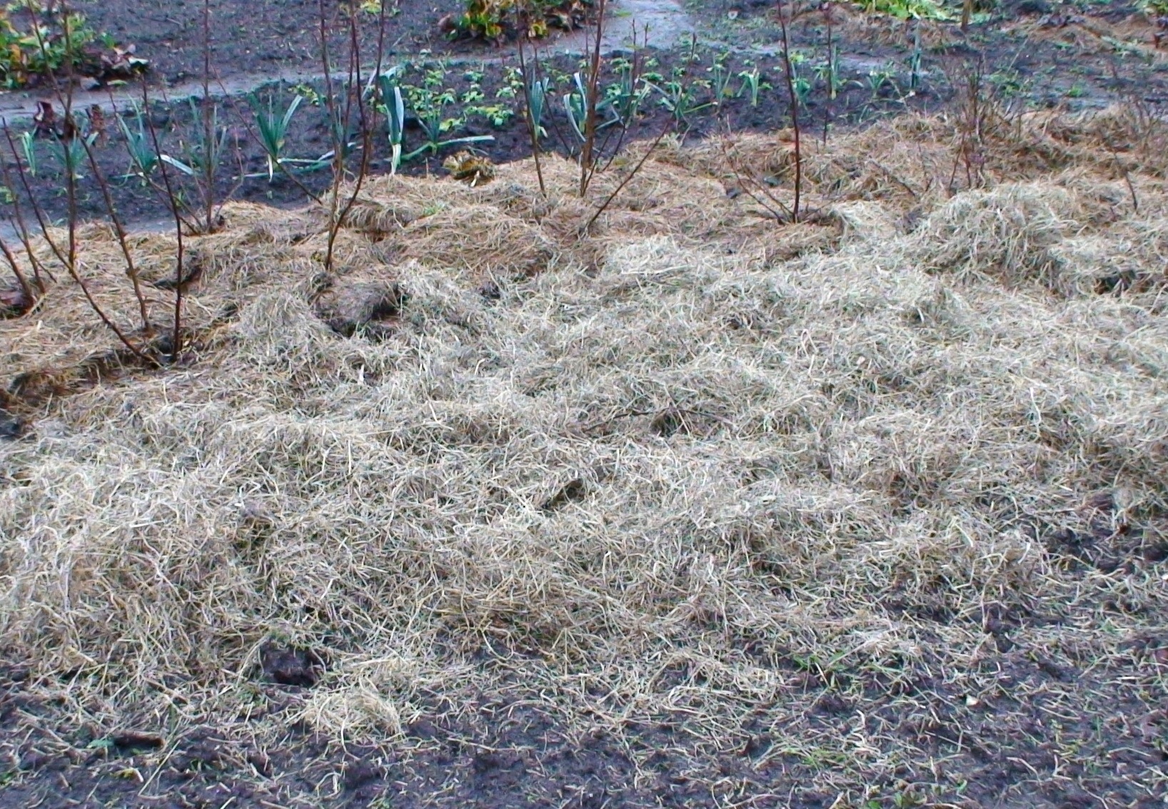 A field is covered with a layer of hay through winter after having removed all weeds.