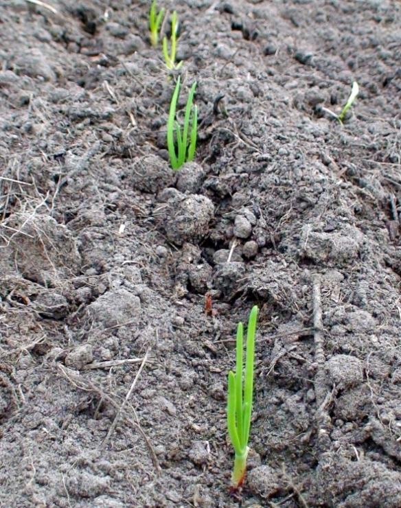 Young onion plants in the midst of winter in a greenhouse.