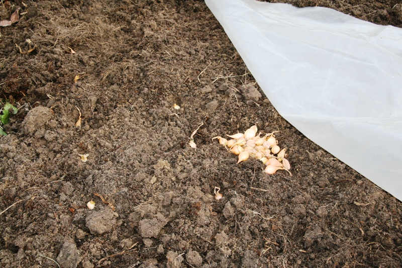 Planting the first onion bulbs in the season, the end of February 2012. A cover of plastic will advance the growth of the bulbs until it gets warmer. In a few months they can be harvested as spring onions, or later the bulbs when they have fully grown out.