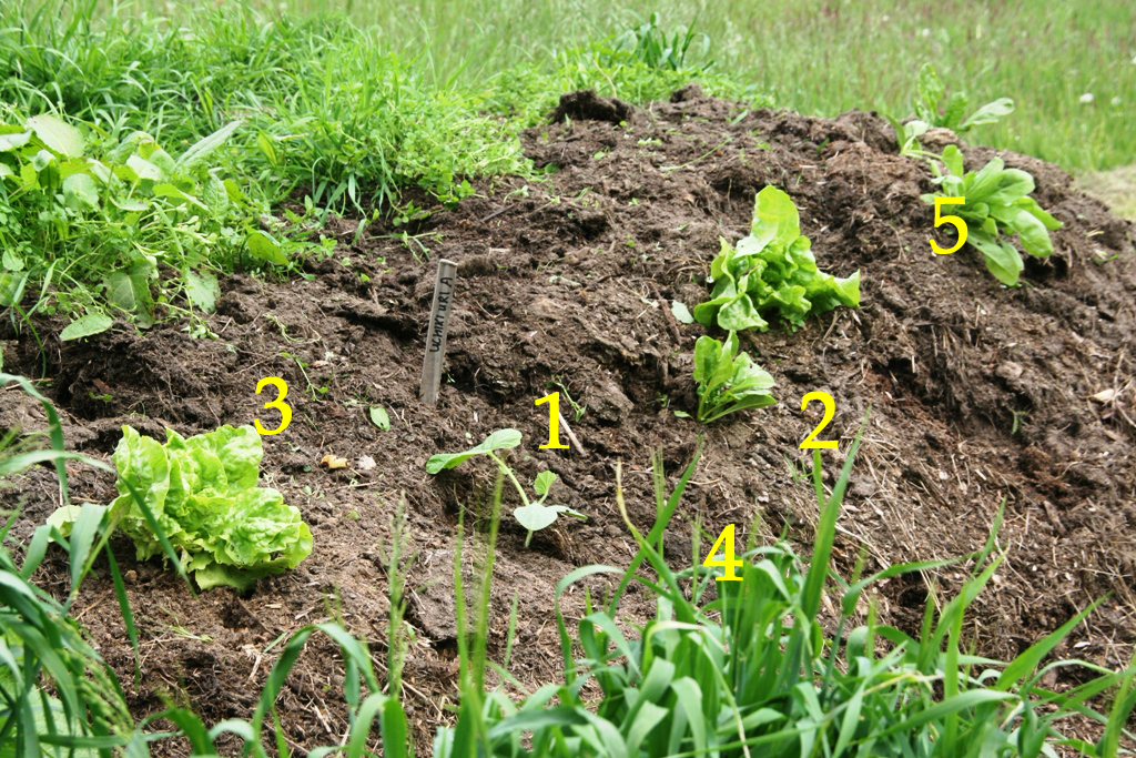 1 = Pumpkin plant (Uchiki kuri) 2 = Chard 3 = Lettuce 4 = Barley 5 = Calendula 2/5 grew by themselves from seeds that were in the compost heap.