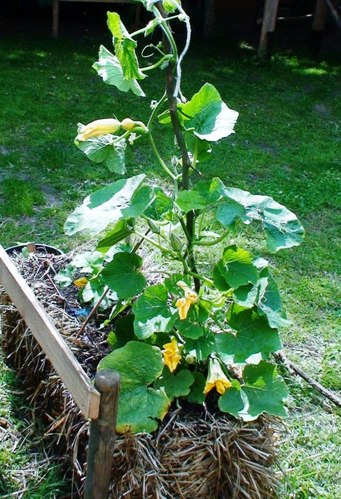 Pumpkin growing on a bale of straw. Drench the straw bale with water, make holes and fill them with soil and compost and plant or sow. Pumpkins grow very well in this way, but it must also be possible with many other plants. It's handy on places where you otherwise could not grow vegetables.