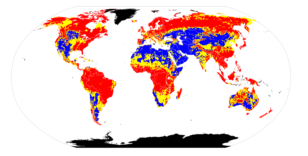 Global variation in soil pH. Red = acidic soil. Yellow = neutral soil. Blue = alkaline soil. Black = no data.