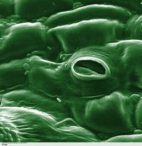 The gases that are exchanged in the process of photosynthesis enter and leave the plant through the stoma. Stomata are pores found in the outer layers of the skin (epidermis) of leaves and stems of plants. Also oxygen that is used for respiration of a plant enters through the stomata. In a process called transpiration, water vapor exits through the same openings. Many plants have most of their stomata at the lower surface of leaves.[8]