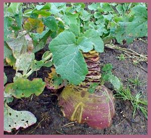 A turnip cultivar that can grow roots of ca 2 kg. Turnips can withstand quite heavy frost. This photo was taken in midwinter after several nights of frost.